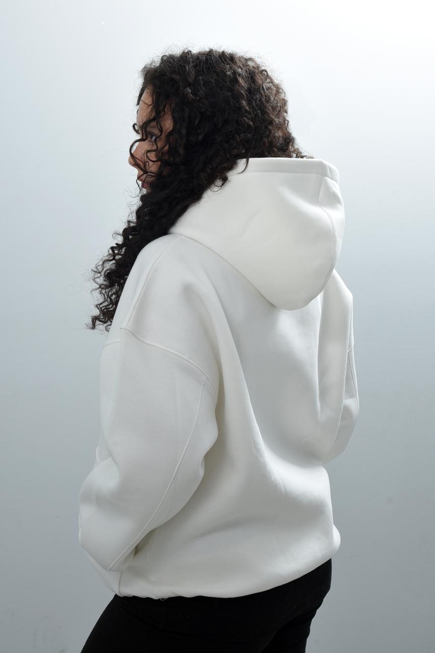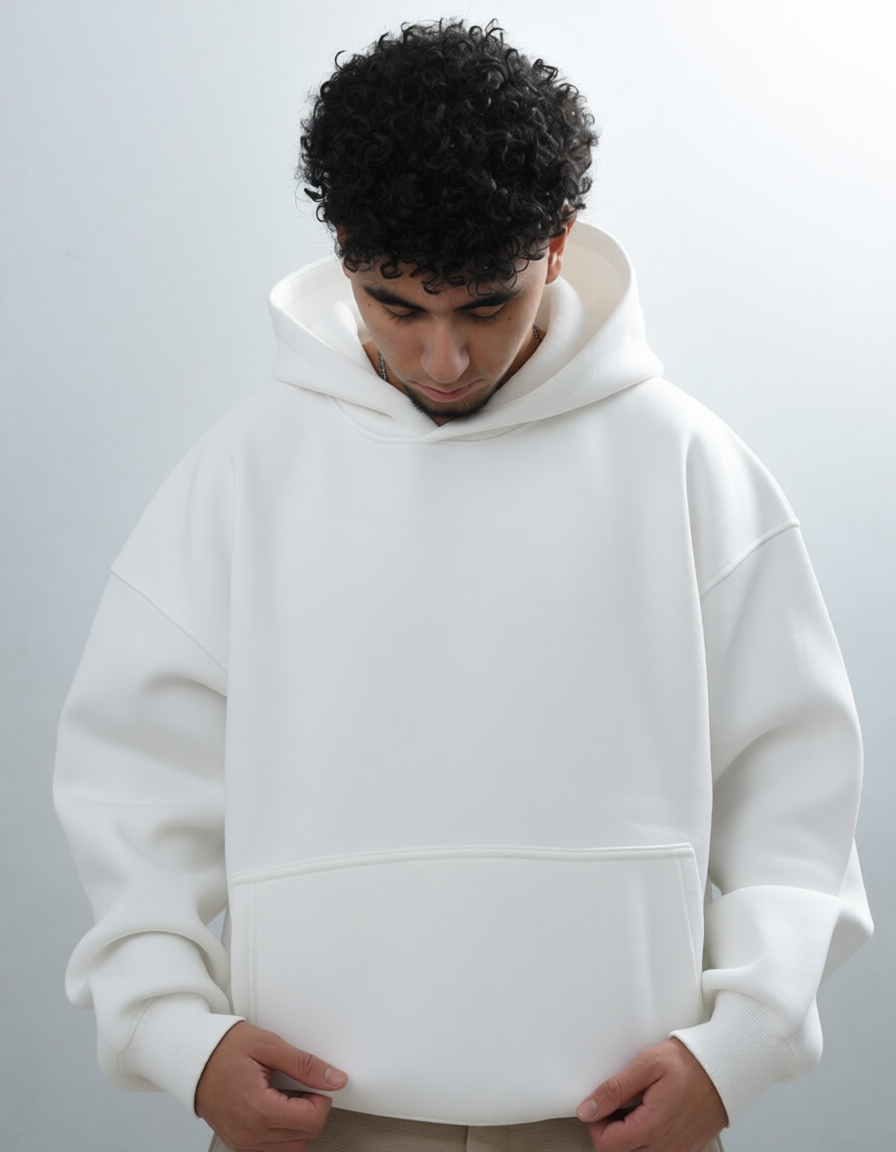 A minimal white hoodie with an oversized fit and thick fabric. Soft on the inside and structured on the outside. Simple, clean, and versatile.